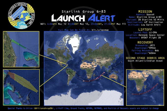 @SpaceX is scheduled to launch the @Starlink Group 6-83 mission from @NASAKennedy NET 4:06UTC May 12