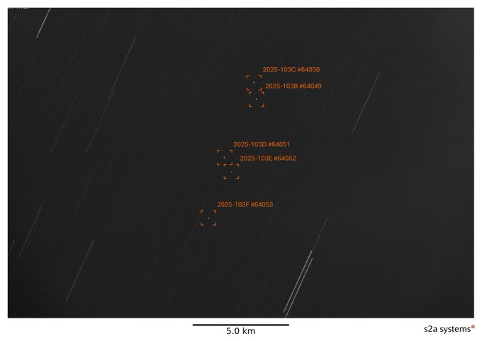 2025-103A to 2025-103F from today's launch of 6 Tianyi satellites. Recorded on 2025-05-17 at 21:21:52 UTC from Switzerland.