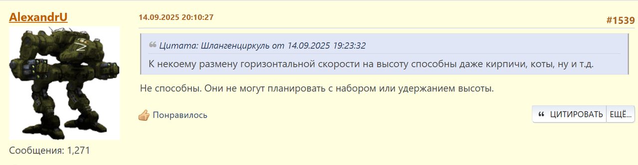 Цитата: Интересант от 15.09.2025 16:14:28Если придать кирпичу угол атаки и соответствующую скорость, то он запросто сможет и сохранять высоту и даже набирать ее...