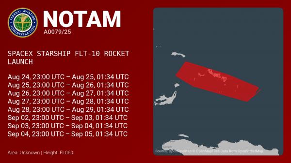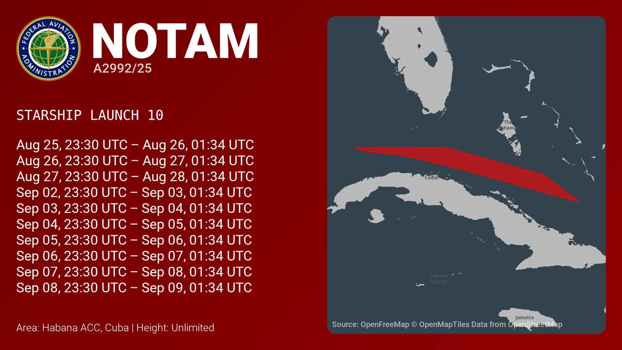 ЦитироватьПерекрытие воздушного пространства для авиации, запланированное на 25 августа, по видимому, оказалось бюрократической ошибкой. Запуск Starship Flight 10 может состояться, как и было ранее объявлено, 24 августа по местному времени. Округ Камерон опубликовал официальные уведомления о закрытии дорог и пляжа на эту дату.