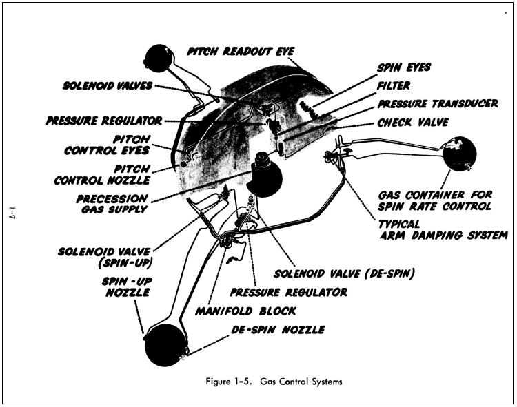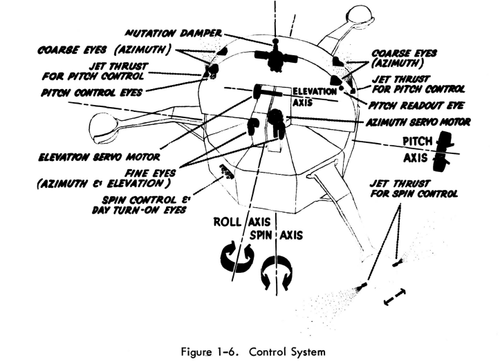 Цитировать...После выгорания второй ступени вся комбинация третьей ступени и космического аппарата раскручивается примерно до 120 об/мин, активируя переключатель ускорения, который запускает таймер последовательности запуска. После выгорания третьей ступени и через 90 секунд после запуска таймера космического аппарата, в космическом аппарате срабатывают пиропатроны, освобождающие три рычага. Центробежная сила выдвигает их. Выдвижение рычагов увеличивает гироскопическую устойчивость колеса и снижает скорость вращения примерно до 96 об/мин. На конце рычага находится баллон с азотом высокого давления, который подает азот в сопла, замедляющие вращение или раскручивающие вращение, также расположенные на трех рычагах. Скорость вращения колеса уменьшается за счет вытеснения азота из сопел, замедляющих вращение, что снижает скорость вращения колеса до 30±5% об/мин. Фотоэлектрические солнечные
