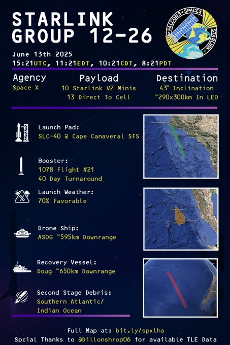 ЦитироватьSpaceX is targeting Friday, June 13 for a Falcon 9 launch of 23 Starlink satellites, including 13 with Direct to Cell capabilities, to low-Earth orbit from Space Launch Complex 40 (SLC-40) at Cape Canaveral Space Force Station in Florida. Liftoff is targeted for 11:21 a.m. ET, with backup opportunities until 11:44 a.m. ET. If needed, additional opportunities are available on Saturday, June 14 starting at 7:18 a.m. ET.