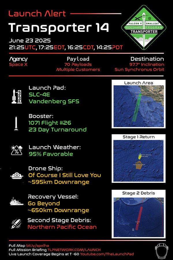 ЦитироватьSpaceX is targeting Monday, June 23 for a Falcon 9 launch of the Transporter-14 mission to low-Earth orbit from Space Launch Complex 4E (SLC-4E) at Vandenberg Space Force Base in California. The 50-minute launch window opens at 2:25 p.m. PT...