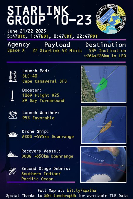 Starlink Fl276 Group 10-23 (V2 Mini L189) x27 – Falcon 9 (B1069.25) – Cape Canaveral SLC-40 – 23.06.2025 05:58 UTC