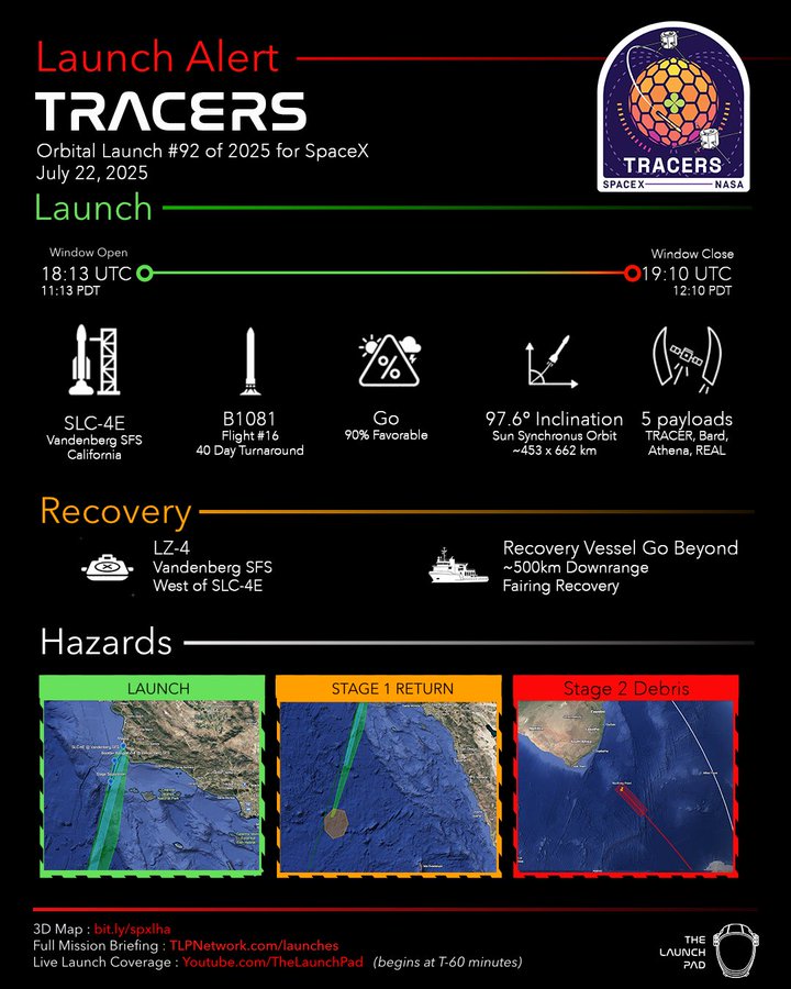 ЦитироватьSpaceX is targeting Tuesday, July 22 for Falcon 9's launch of NASA's TRACERS mission from Space Launch Complex 4 East (SLC-4E) at Vandenberg Space Force Base in California. The 57-minute launch window opens at 11:13 a.m. PT. If needed, a backup opportunity is available on Wednesday, July 23 at the same time.