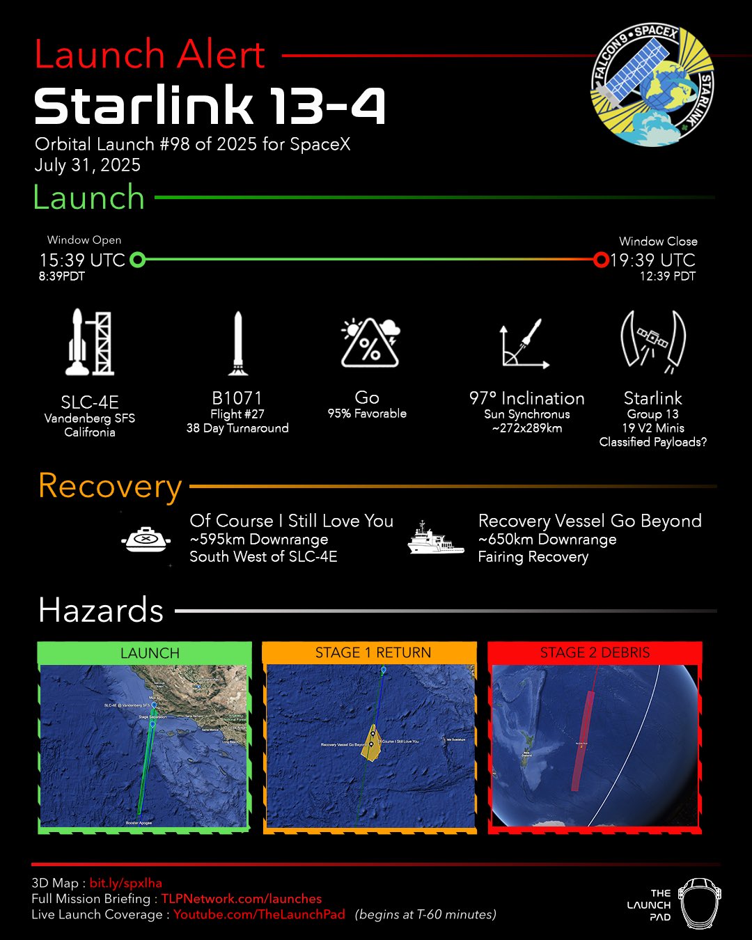Starlink Fl287 Group 13-4 (V2 Mini L200) x19, Starshield х2 – Falcon 9 (B1071.27) – Vandenberg SLC-4E – 31.07.2025 18:35 UTC
