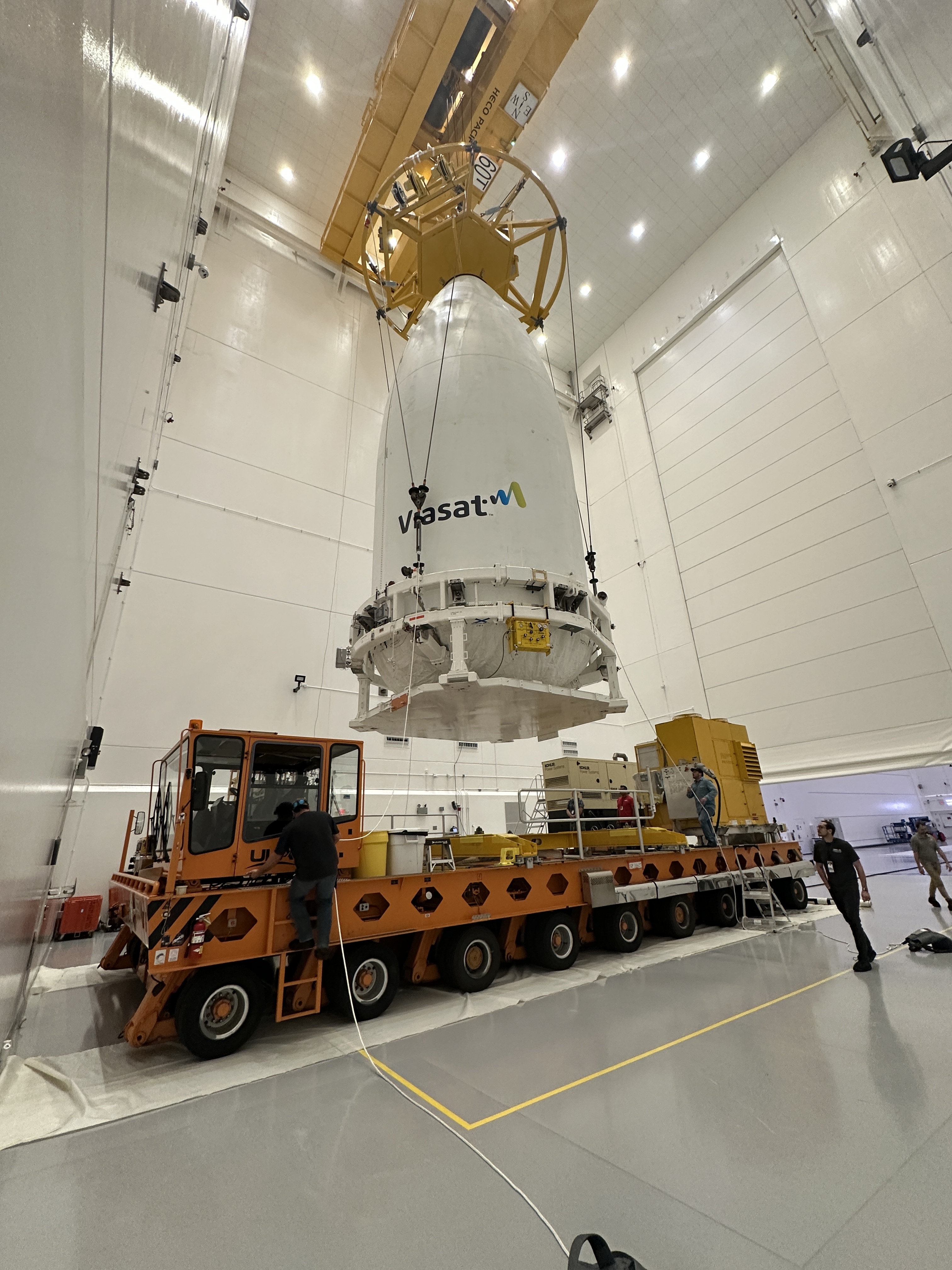 The encapsulated ViaSat-3 F2 spacecraft arrives at the VIF for hoisting atop the Atlas V rocket. Photo by United Launch Alliance