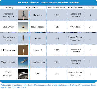 This report profiles six companies that have made significant progress in development of suborbital reusable launch vehicles (SRLVs). The suborbital service providers in this publication aim to reach or surpass the altitude of 100 kilometers (62 miles). Current concepts for suborbital vehicles either launch vertically like a traditional launch vehicle, at a high altitude from a carrier craft, or horizontally take off under rocket power from a runway. The vehicles then either use rockets or parachutes to assist landing vertically, or they use wings to land like a glider or conventional aircraft.