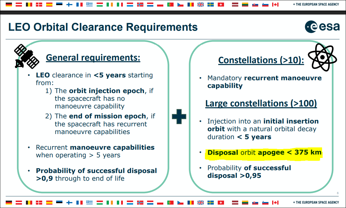 Лично я не нашёл нигде в документе, на который ссылается Demir_Binici, запрета просто перевести спутник на орбиту высотой, допустим, 350 км и забыть про него. Сказано, что должен быть полностью утилизирован как можно быстрее, но не позже, чем в течении пяти лет. Использование низких орбит утилизации, с которых спутник точно сойдёт сам быстрее пяти лет, в это требование явно укладывается. Но, с другой стороны, если раньше в требованиях прямо прописывалась опция "left in an orbit in which, using conservative projections for solar activity, atmospheric drag will limit the lifetime to as short as practicable but no more than 25 years", т.е. использование орбиты утилизации, то теперь такие слова прямо не прописаны. Возможно, что Demir_Binici воспринял устранение слов, прямо прописывающих возможность использование орбиты утилизации, как запрет на её использование.