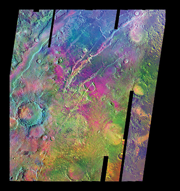 Mineralogy surrounding the Nili Fossae, Mars, as seen in a mosaic of infrared images from the National Aeronautics and Space Administration's Mars Odyssey Thermal Emission Imaging System (THEMIS).