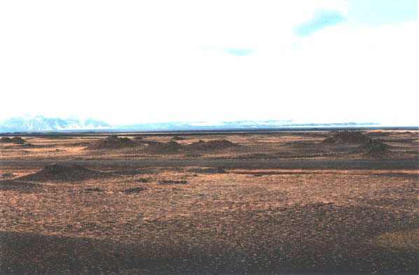 Field photograph of a cluster of rootless volcanic cones south of the Myrdalsjokull ice cap glacier (i.e., in the background) in southern Iceland. Photograph taken from the highway in Iceland on May 9, 1997. The cones are tens of meters in height and up to 100 m in basal diameter and represent a consequence of the interaction of erupting lava (basalt and Icelandites) with ground water.