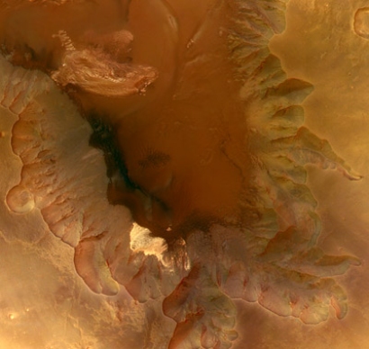 The depression of Juventae Chasma, located north of Valles Marineris, cuts more than 5000 metres into the plains of Lunae Planum. The floor of Juventae Chasma is partly covered by dunes.