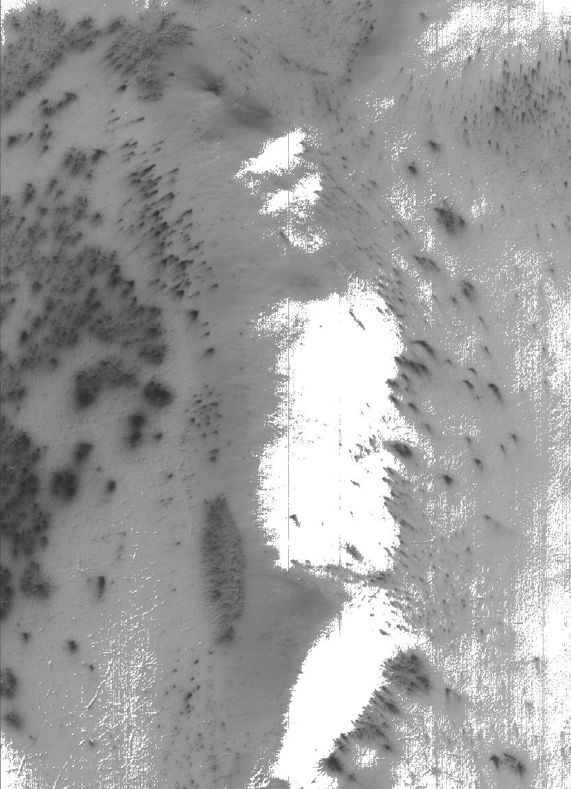 In the north-eastern part of the scene, there is a mountain composed of bright, layered material. This mountain is approximately 2500 metres high, 59 kilometres long and up to 23 kilometres wide.