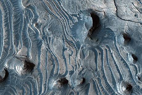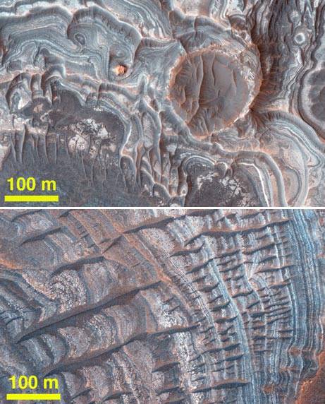 Фотографии с высокой разрешающей способностью, полученные Mars Reconnaissance Orbiter, показывают детали происхождения слоистых осадков в долине Маринера.