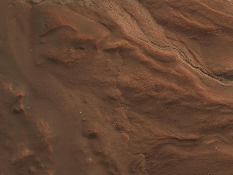 Layers in the lower portion of two neighboring buttes within the Noctis Labyrinthus formation on Mars are visible in this image from the High Resolution Imaging Science Experiment (HiRISE) camera on NASA's Mars Reconnaissance Orbiter.