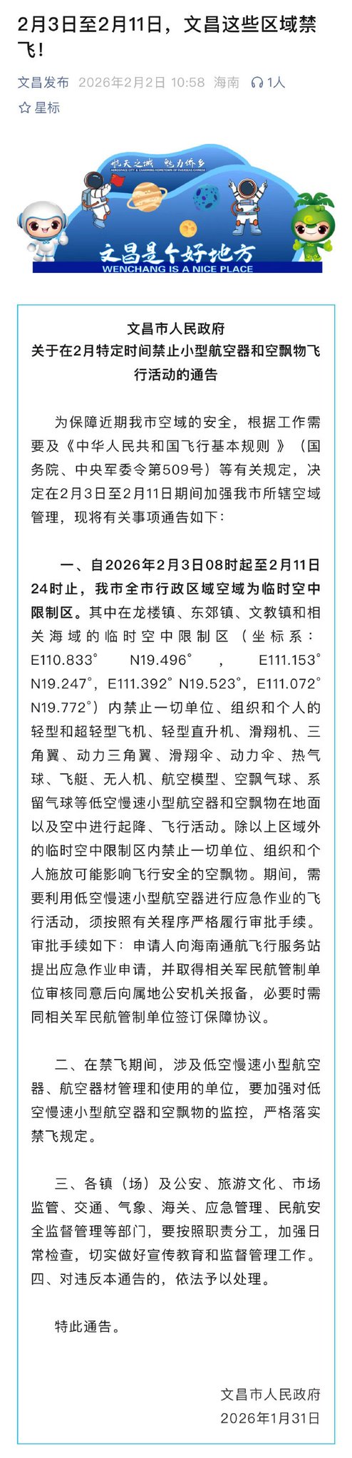 Drone no-fly notice has been published by the Wenchang official. Likely be the Mengzhou Max-Q abort test. Window starts from 03 Feb to 11 Feb 2400.