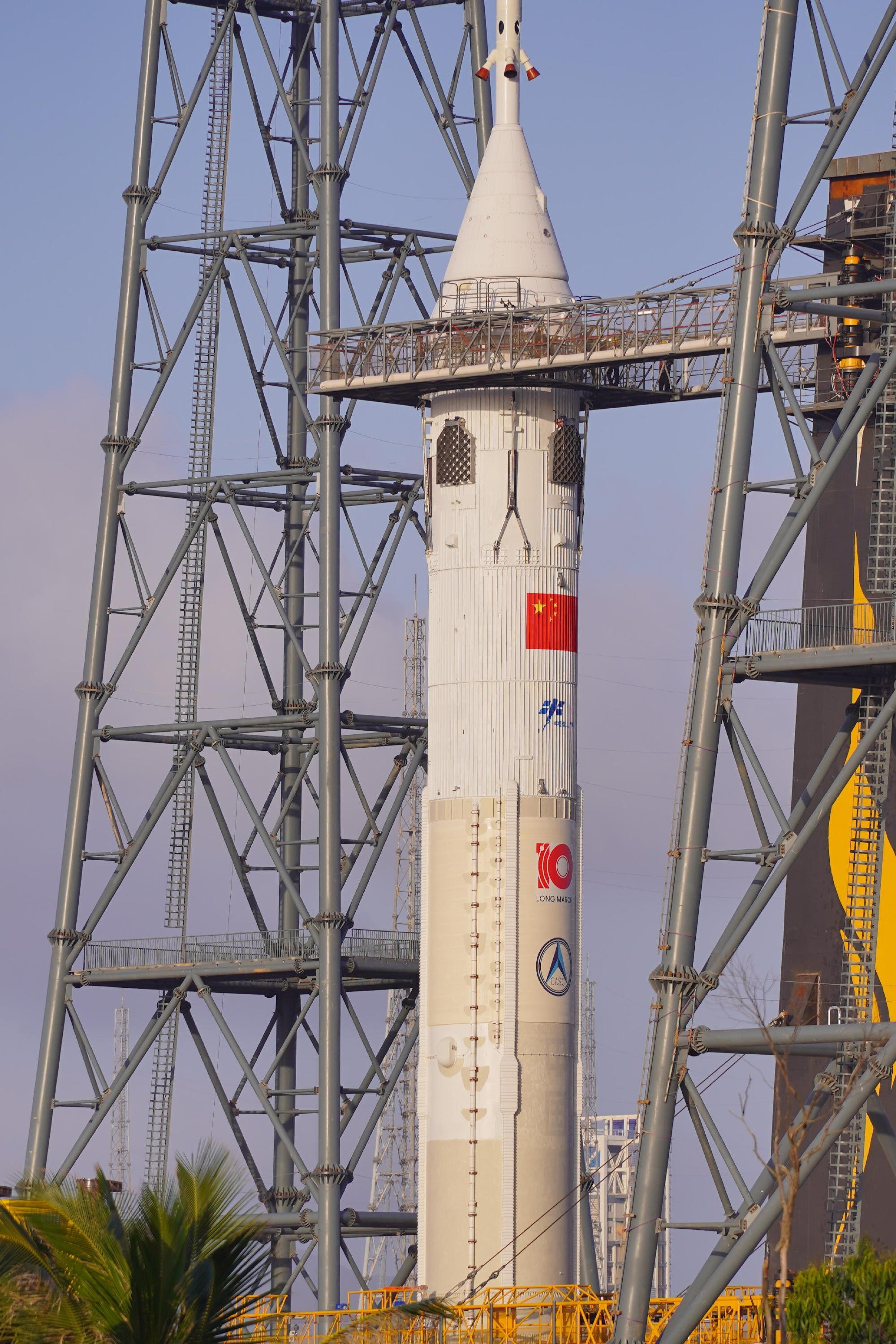 Теперь, когда габариты изделия примерно соответствуют ожидаемым размерам штатной первой ступени «Чанчжэн-10А» в полётной конфигурации, проводятся стыковочные и габаритные испытания с мобильной пусковой платформой. В их рамках к основанию ступени подключены две штатные заправочно-дренажные стрелы, а в зоне расположения межступенчатого отсека смонтированы площадки доступа, прикреплённые к частично построенной сервисной башне мобильной платформы.