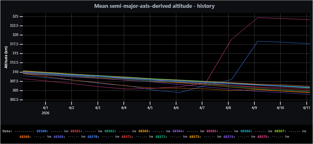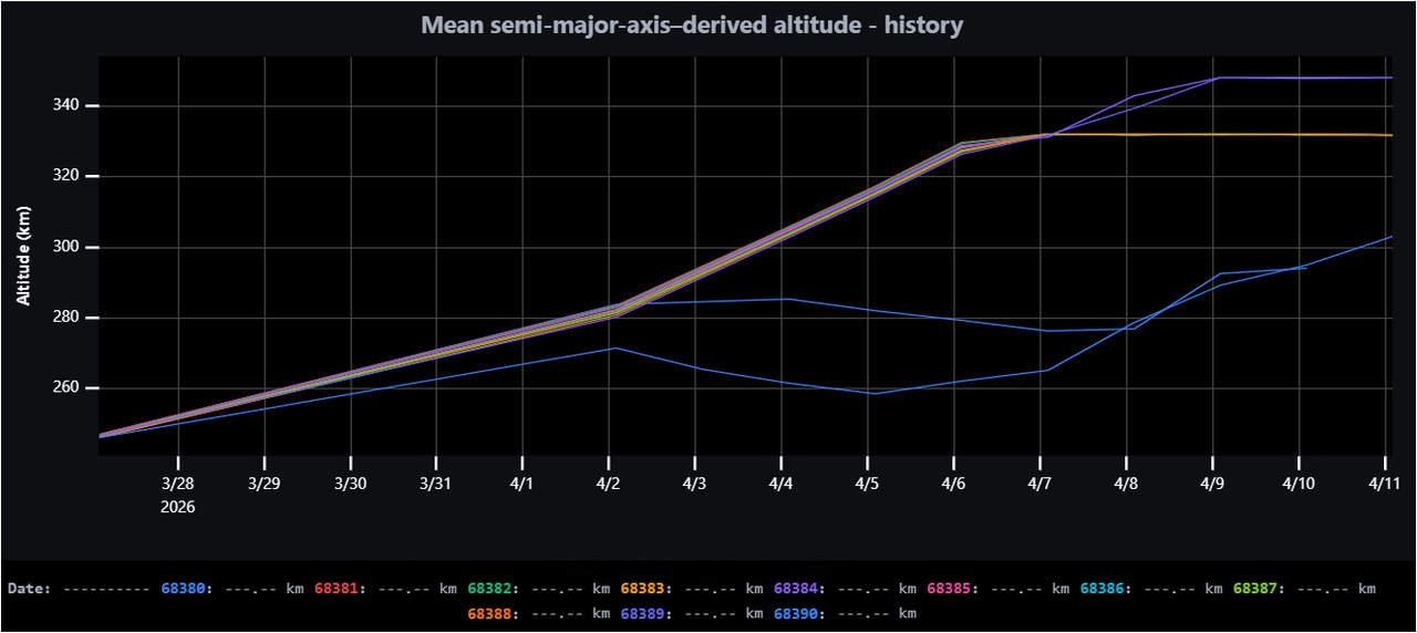 Цитата: VSATman от 11.04.2026 22:02:05Я попробовал сравнить поведение Рассветов с поведением "старших товарищей", с тем днем Рождения. Вот к примеру СтарЛинк 37223, НОРАД 68387. Запущен 26 марта 2026  на орбиту (если верить ВИКИ)  Perigee: 283.5 km ; Apogee: 285.6 km.