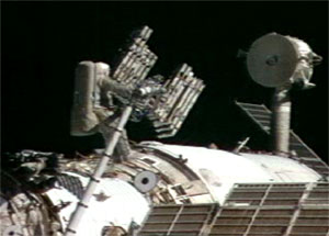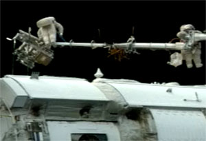The remaining three bundles and their adaptor were delivered by Discovery during STS-116 last December and attached to PMA-3 by spacewalkers Bob Curbeam and Sunita Williams. Williams was intravehicular officer for Wednesday's spacewalk, advising and keeping the spacewalkers on schedule.