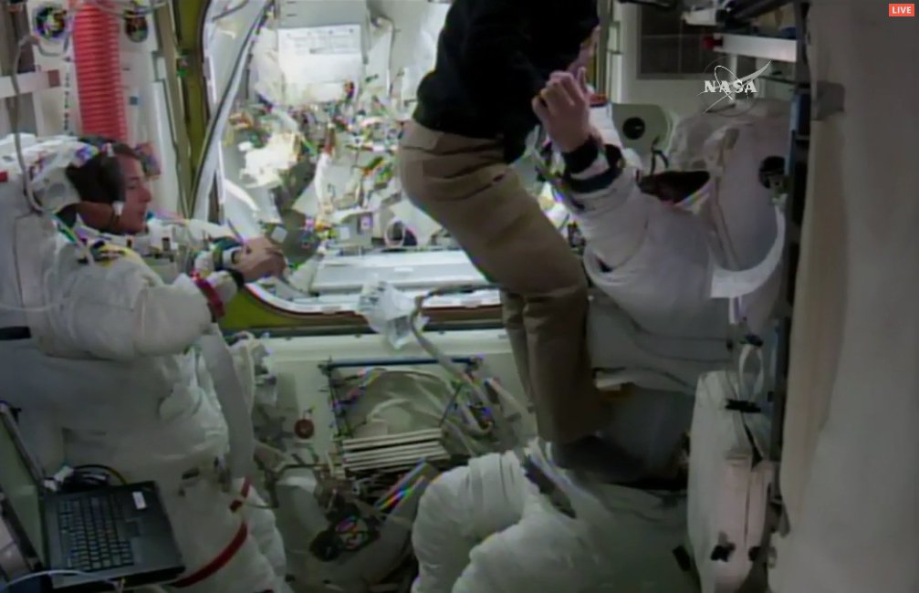 As has been the usual case with this particular crew, they remained well ahead of the day's timeline, pressing into depressurization of the airlock to head outside with over half an hour to spare. Once the airlock was at vacuum, Thomas Pesquet opened the outer hatch and the two space suits were switched to battery power at 11:24 UTC, marking the formal start of the day's planned 6.5-hour spacewalk.