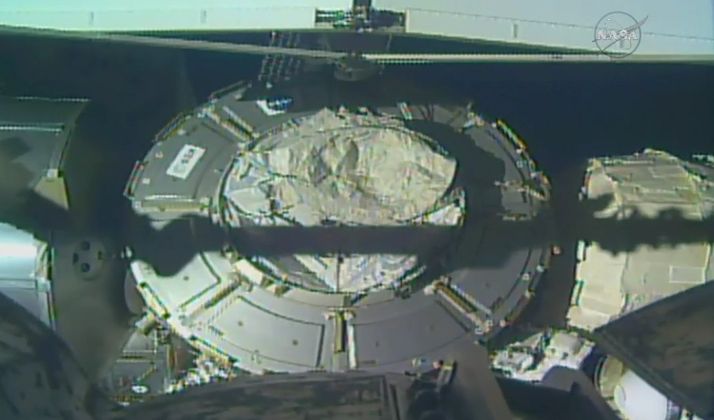 Three axial shields installed on the Node 3 Port CBM and the CBCS flap has been closed. (CBCS - Centerline Berthing Camera System)