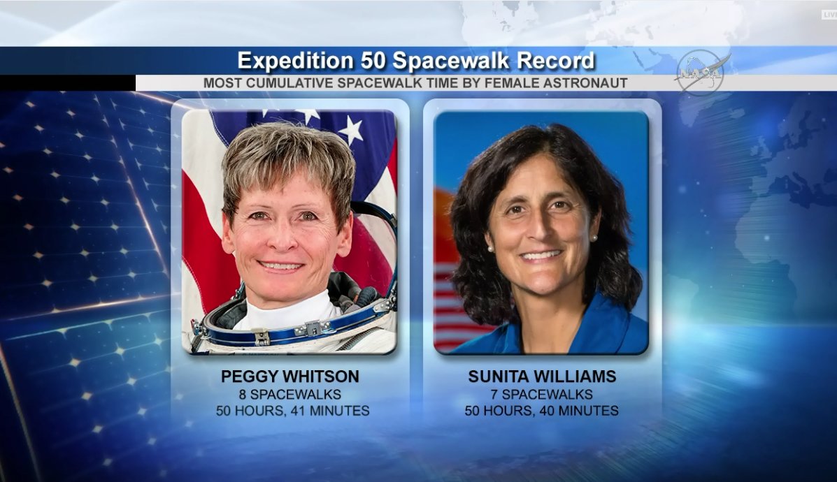 Для Кимброу это уже шестой выход за борт МКС, для Уитсон - восьмой. По завершении нынешнего выхода в открытый космос общий срок пребывания 57-летней Уитсон за бортом МКС может превысить прежний рекорд, установленный астронавтом НАСА Сунитой Уильямс и составляющий 50 часов 40 минут.