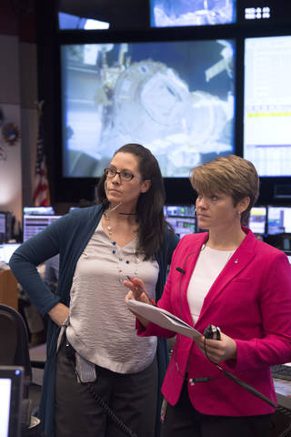 Flight Director Emily Nelson and Capcom Anne McClain in Houston work to come up with a plan to replace a lost thermal and micrometeoroid shield during a spacewalk.