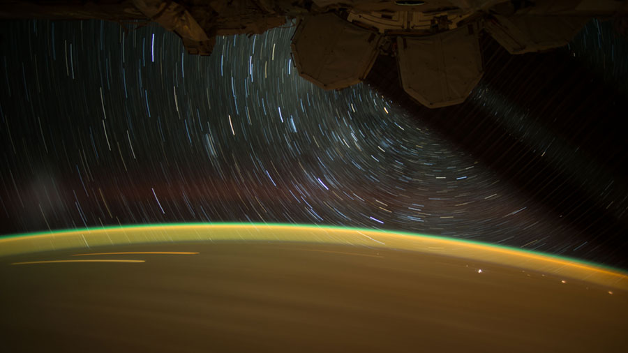 This long exposure photograph shows the Earth, its atmospheric glow and stars from the International Space Station.