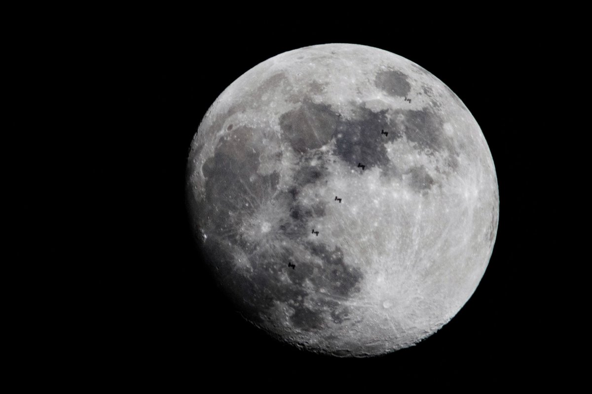 Look at the center of the Moon. There is a small black "H" looking spot. THATS 6 PEOPLE TRAVELING 17,200 MPH WITH THE MOON AS A BACKDROP.