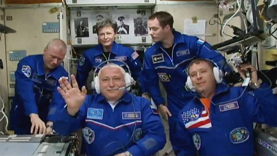 Yurchikhin and Fischer joined three other residents living on the International Space Station. Credit: NASA TV