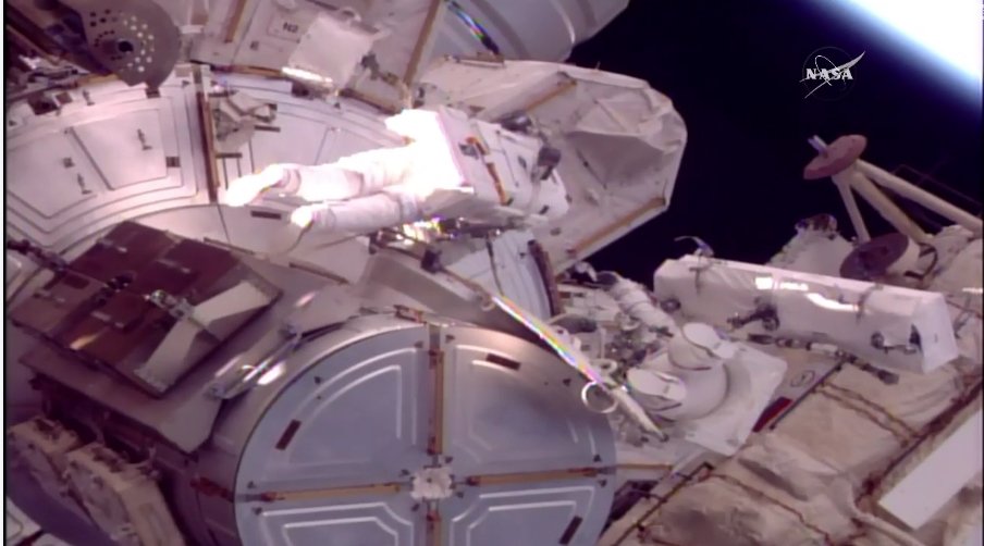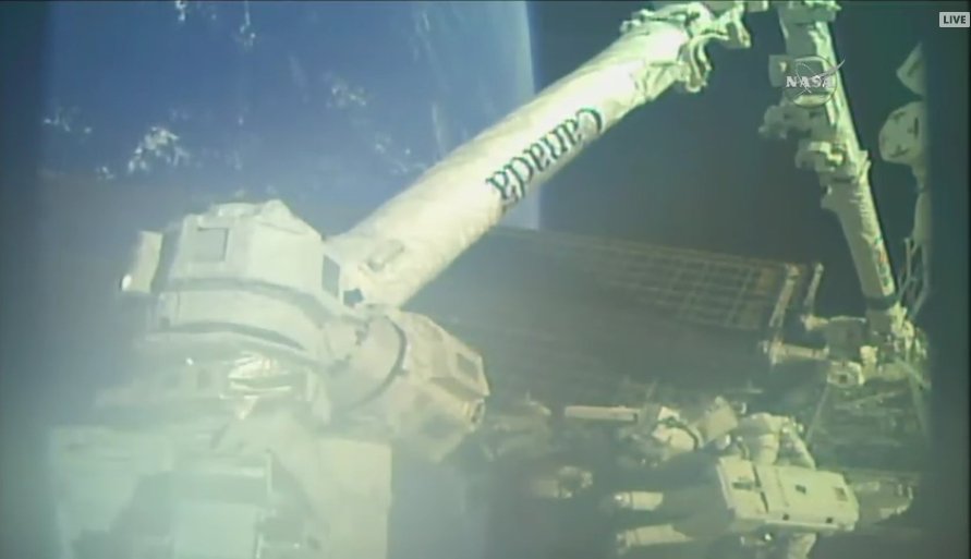 Excellent view of @AstroPeggy from @Astro2fish as he waits for the arm to move into position. http://bit.ly/2qY0o7D