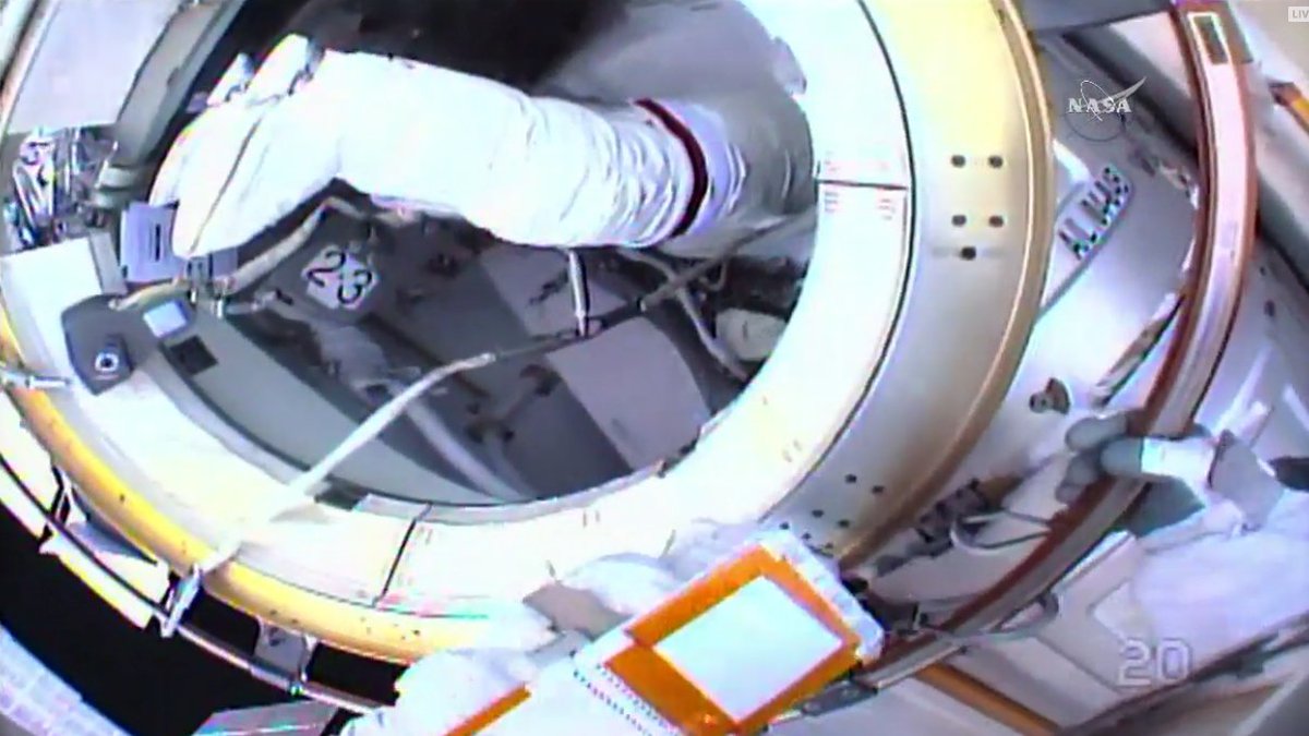 EVA42: Whitson is standing by at the airlock hatch; all but two of the EVA's original tasks have been accomplished