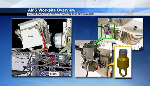 Whitson made her way up the truss and around AMS-2 to reach the IPA connector panel wh ere she was to install the 1553 Feedback Terminator – essentially acting as a line tester to verify this particular command/data path is still functional after sitting unused for over six years since the Alpha Magnetic Spectrometer was installed on the STS-134 mission.