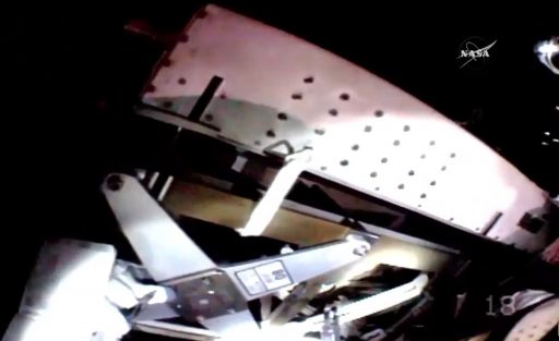 Still well under the PET+4-hour threshold set for the EVA, Mission Control was able to add another task for Fischer – retrieving and installing a shield on the forward base of Pressurized Mating Adapter 3.