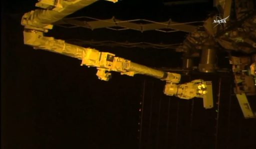 Jack Fischer holding onto the spare ExPCA while riding the robotic arm – Photo: NASA TV