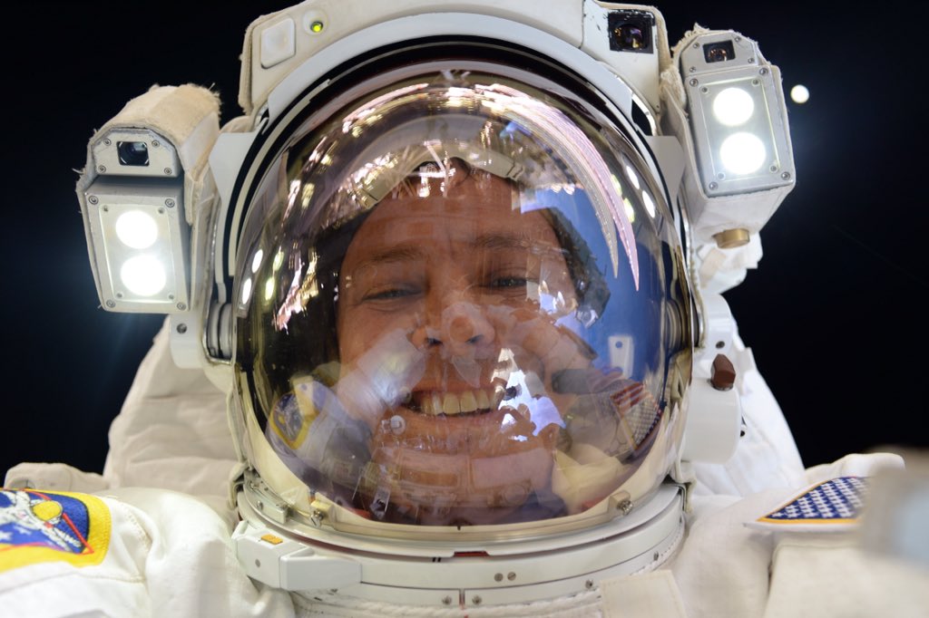#SpaceSelfie-sorry about reflections, but you can see moon next to my helmet & you might notice the size of my smile-spacewalks are AWESOME!