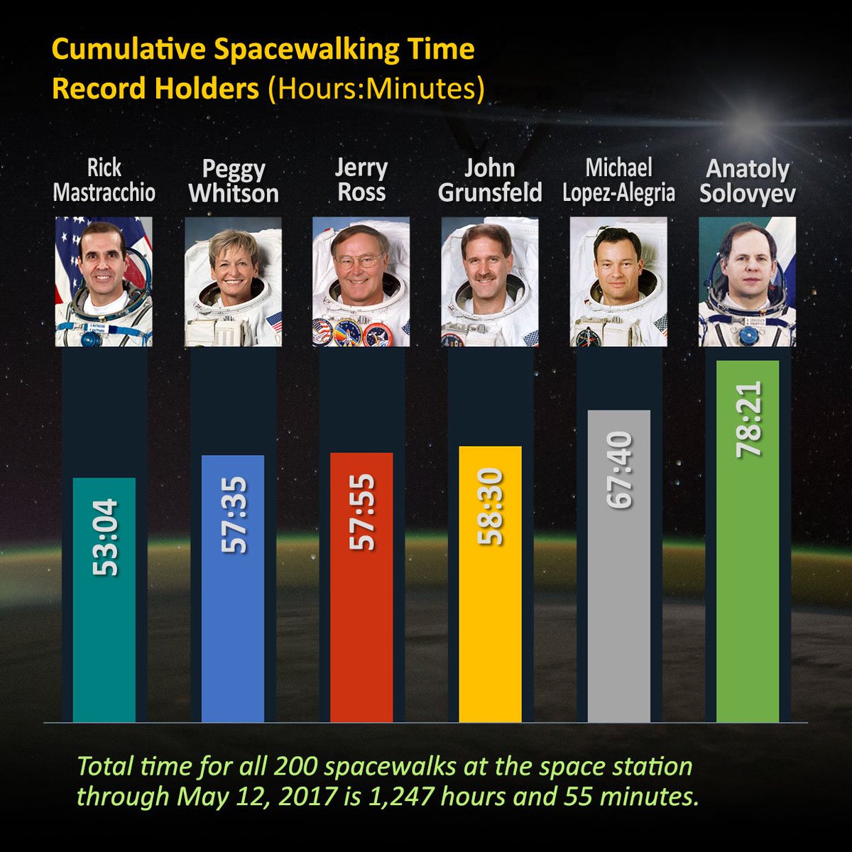 .@AstroPeggy is the fifth place all-time record holder in cumulative spacewalk time after completing her ninth spacewalk on Friday.