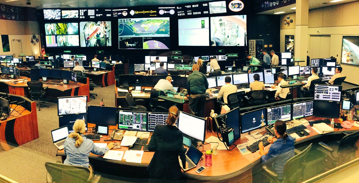 The Flight Control Room is bustling as @Astro2fish and @AstroPeggy prepare to head outside for a quick repair mission.