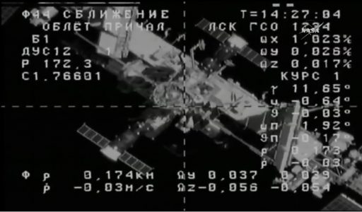 Pulsing its DPO thrusters, Progress initiated a closing rate of 0.8 meters per second to cover the last 175 meters to docking. The craft slowed down as it got closer and powered up its Docking Mechanism to be ready for contact with the Service Module at a relative speed of 0.1 meter per second.