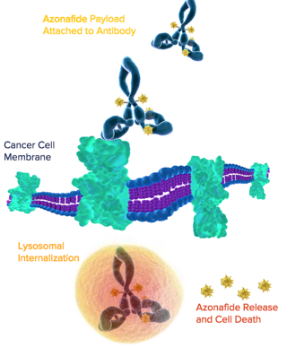 Once the Azonafide Antibody-Drug Conjugate (ADC) binds to the tumor surface, the construct is internalized by the tumor cells where the antibody is released and can begin cell death. Azonafide ADCs allow delivery of the drug to the tumor site, thereby avoiding the toxic side effects associated with chemotherapy.