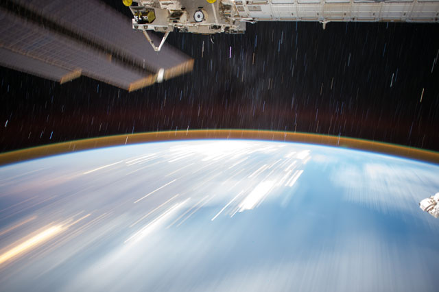 This long-exposure photograph of Earth and starry sky was taken during a night pass by the Expedition 52 crew aboard the International Space Station. The Japanese Kibo module and part of the station's solar array are visible at the top.
