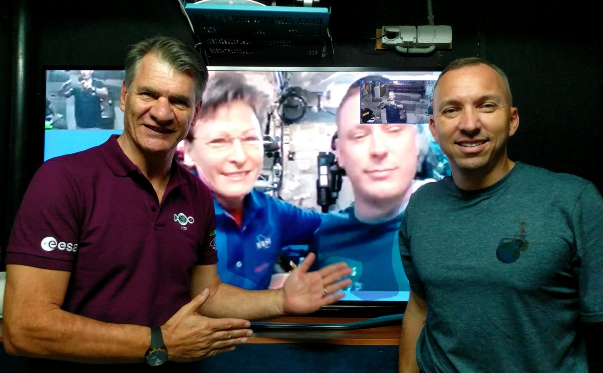 .@astro_paolo and I getting the most current status of @Space_Station from @AstroPeggy & @Astro2Fish before we go down to the launch site.