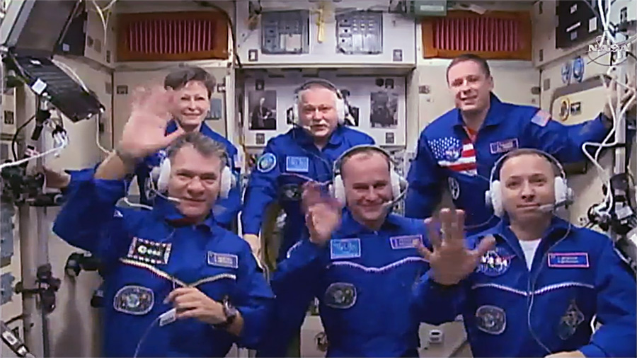 The Expedition 52 crew expanded to six today. In the front row from left are the newest crew members Paolo Nespoli, Sergey Ryazanskiy and Randy Bresnik. In the back row are Peggy Whitson, Fyodor Yurchikhin and Jack Fischer. Credit: NASA TV
