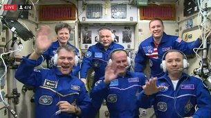 The six astronauts that now live on the Space Station had a brief press conference and link-up with friends and family shortly after their arrival.