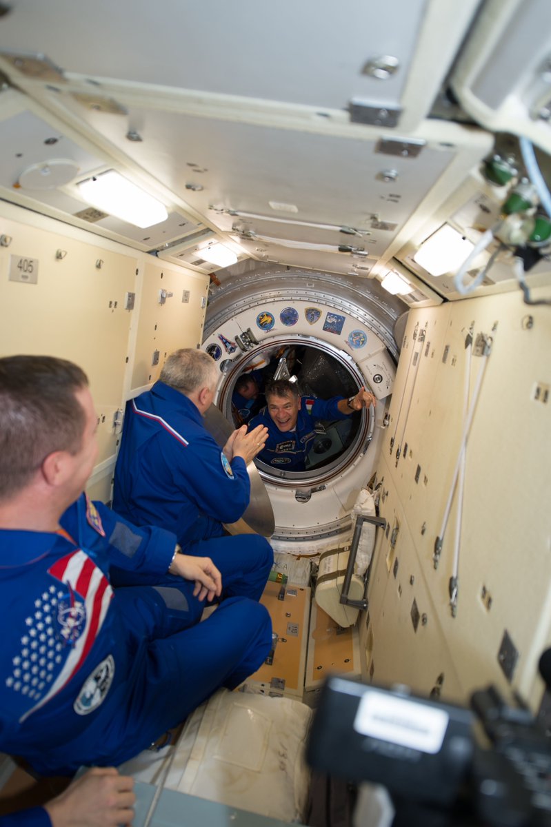Cosmonaut Sergey Ryazanskiy joined his crewmates Nespoli and Bresnik this afternoon familiarizing themselves with the station's emergency equipment. The new trio explored their new home in space taking note of safety gear locations and escape paths.