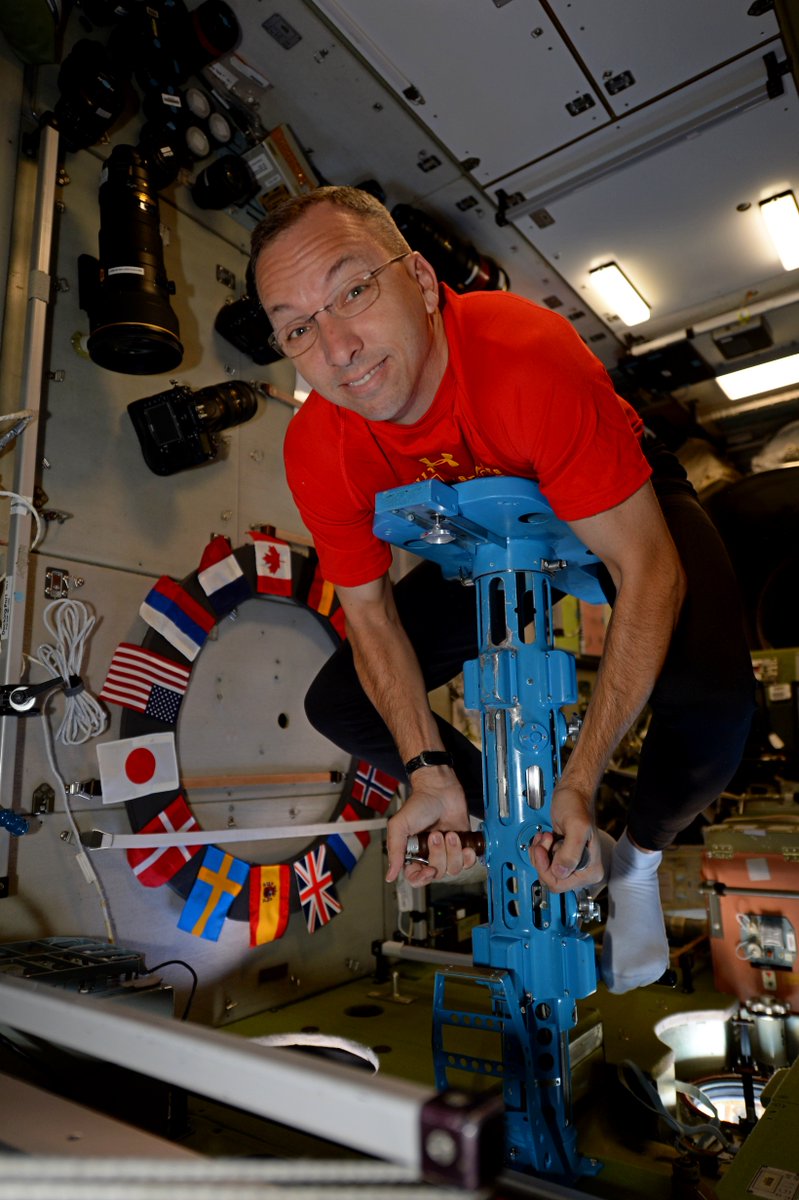 Astronaut Paolo Nespoli of the European Space Agency is on his third spaceflight. Nespoli took part in the Sarcolab-3 study using the Muscle Atrophy Research & Exercise System (MARES) chair in the Columbus module. The data collected for Sarcolab-3 will be used to assess microgravity's impact on muscle loss in astronauts, focusing specifically on the calf muscle in the leg.