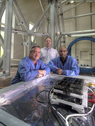 Chuck Clagett, Larry Kepko, and Michael Johnson were instrumental in developing the Dellingr 6U CubeSat shown here inside Goddard's magnetic calibration facility.