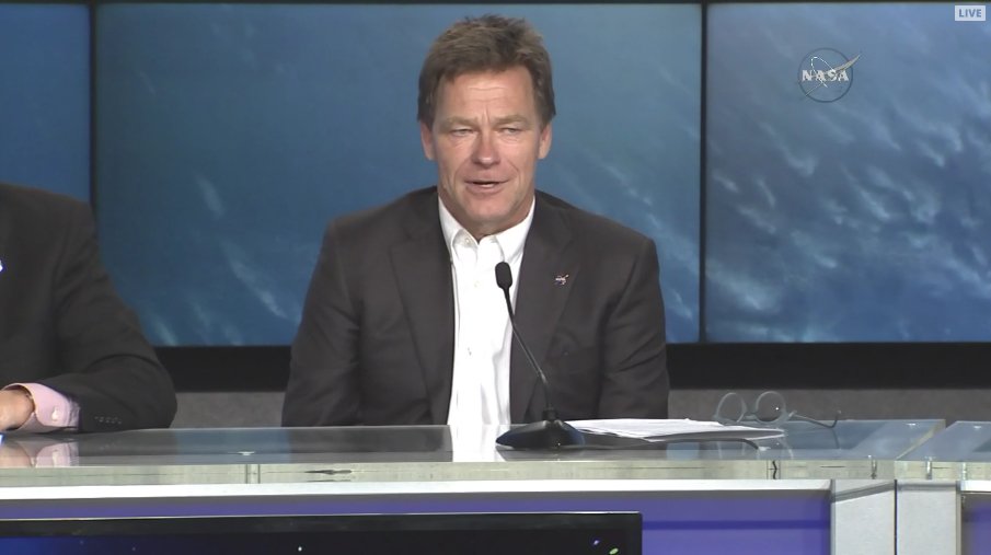 Press conference at KSC press site. Dan Hartman and Hans Koenigsmann.