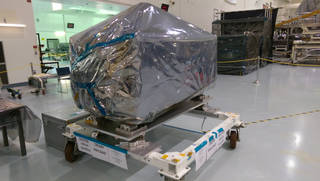 The ISS-CREAM payload was delivered to NASA's Kennedy Space Center in August 2015. The experiment is shown wrapped in plastic layers used to protect its sensitive electronics during shipment.