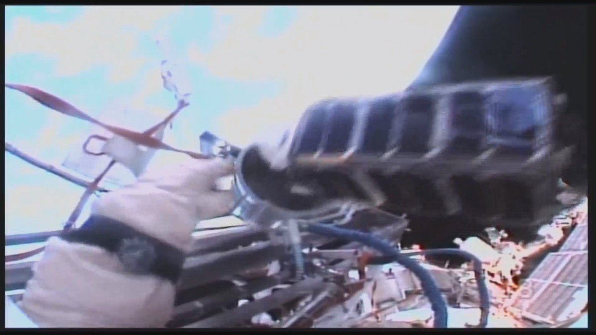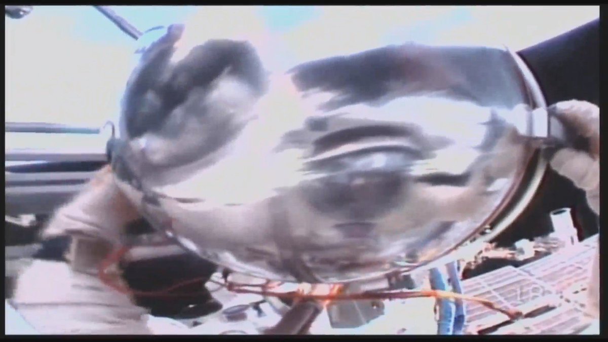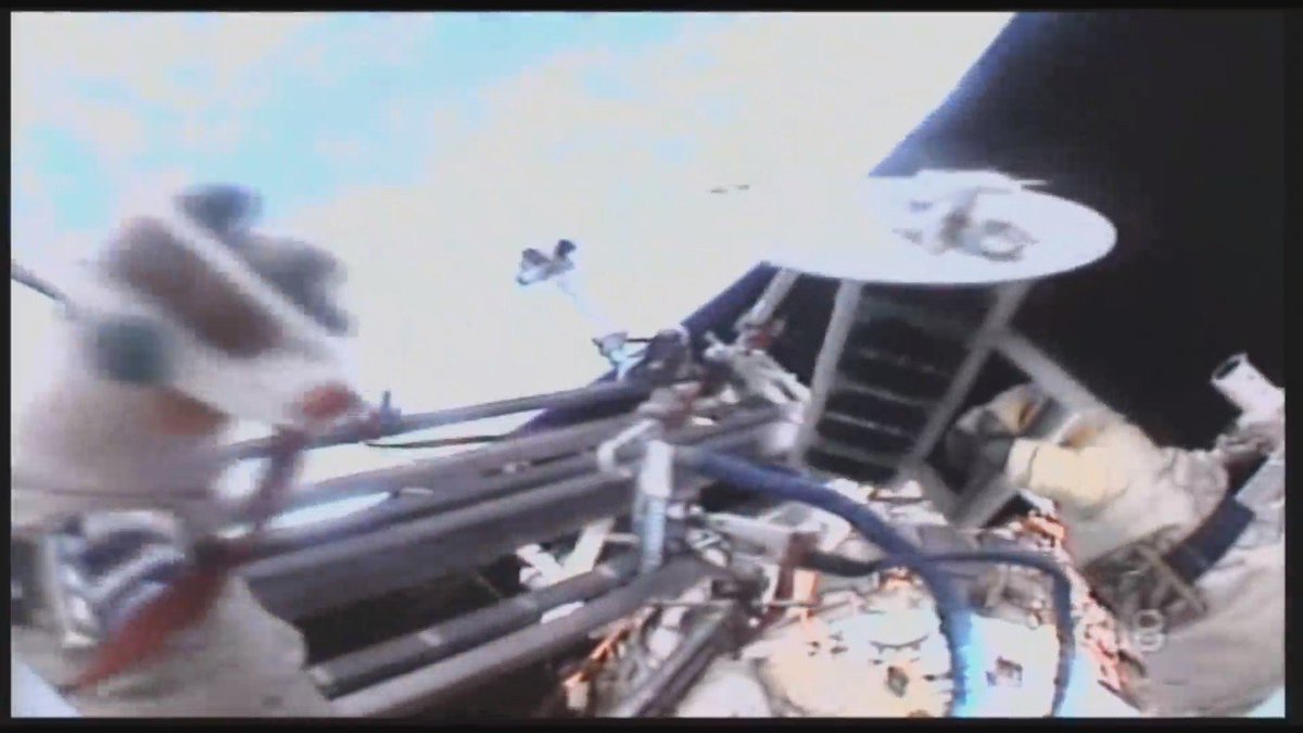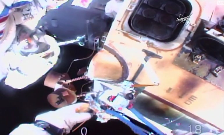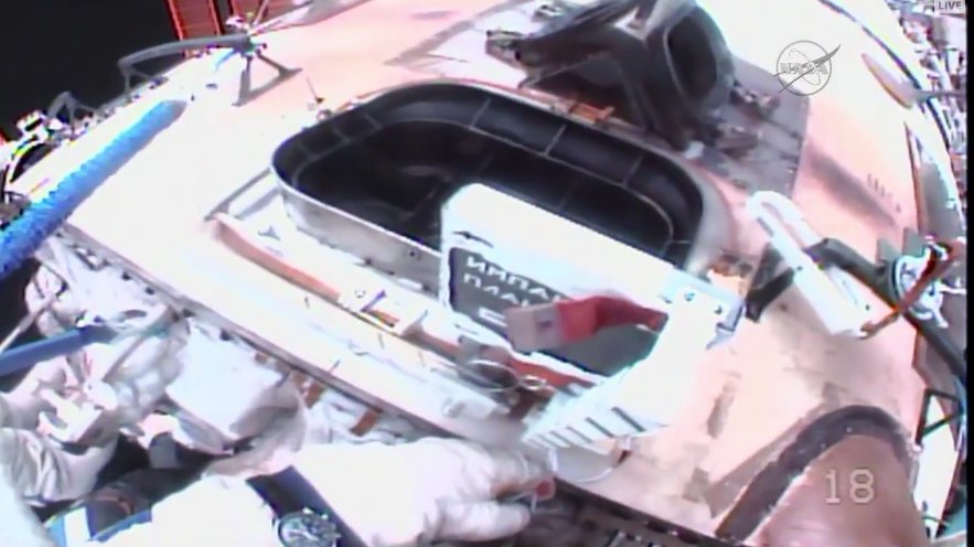 Impakt installed right on the rim of the thruster pod. Spacewalkers now cleaning up & taking photos before moving back to Pirs.